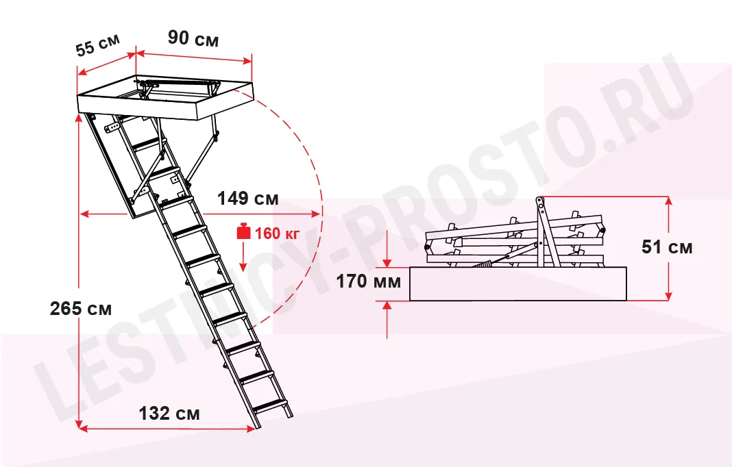 Термоизоляционная крышка имеет усиленную теплозащиту, облицована с двух сторон ДCП белого цвета. В комплекте деревянный стержень для открывания, металлический поручень и защитные накладки на ножки. Лестница идеально подходит для соединения с холодным чердаком.