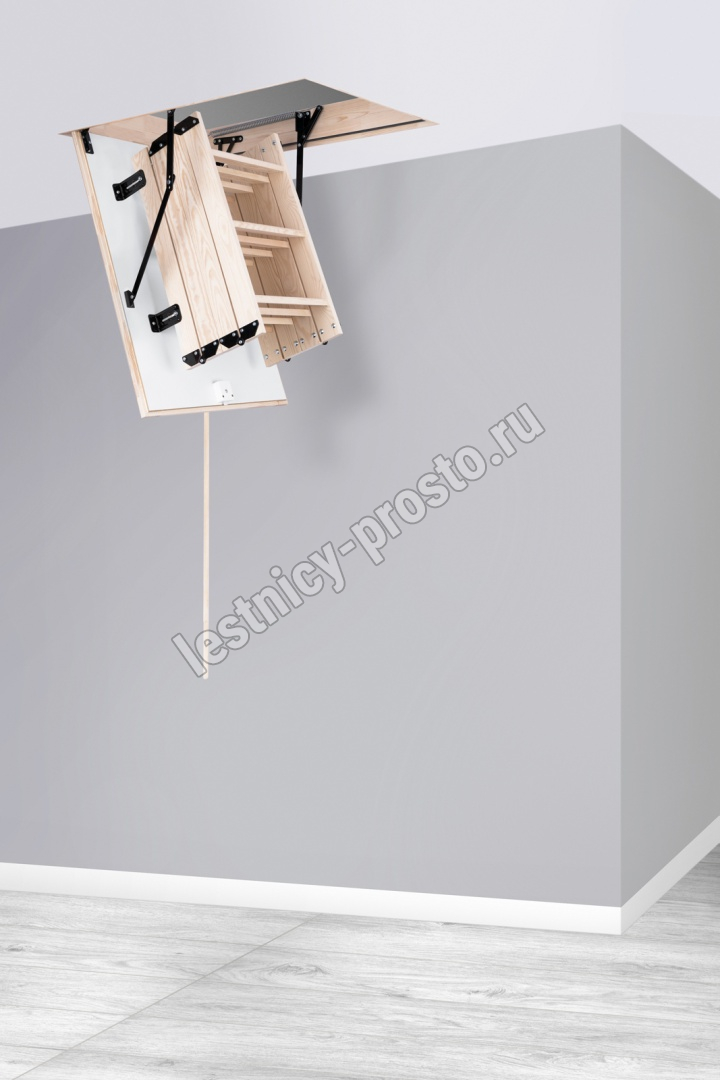 Лестница складная четырехсекционная, изготовлена из массива сосны. Термоизоляционная крышка типа "сэндвич" утеплена пенопластом толщиной 20 мм, облицована с двух сторон ДСП белого цвета