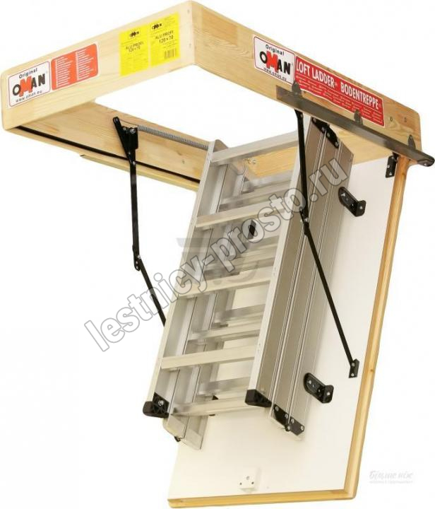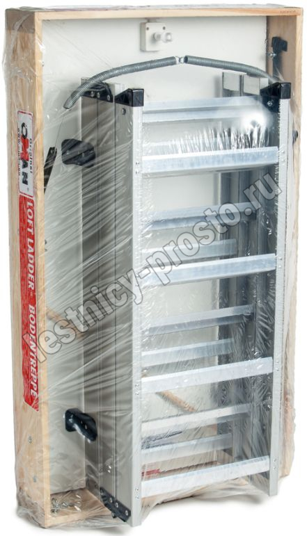 Складная 3-х секционная чердачная лестница. Рабочая поверхность полностью выполнена из алюминия. Термоизоляционная крышка типа "сэндвич" имеет усиленную теплозащиту, облицована с двух сторон ДВП белого цвета. По контуру короба имеется уплотнитель; Все металлические элементы лестницы покрыты порошковой краской.
