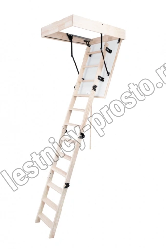 Лестница складная четырехсекционная, изготовлена из массива сосны. Термоизоляционная крышка типа "сэндвич" утеплена пенопластом толщиной 20 мм, облицована с двух сторон ДСП белого цвета.