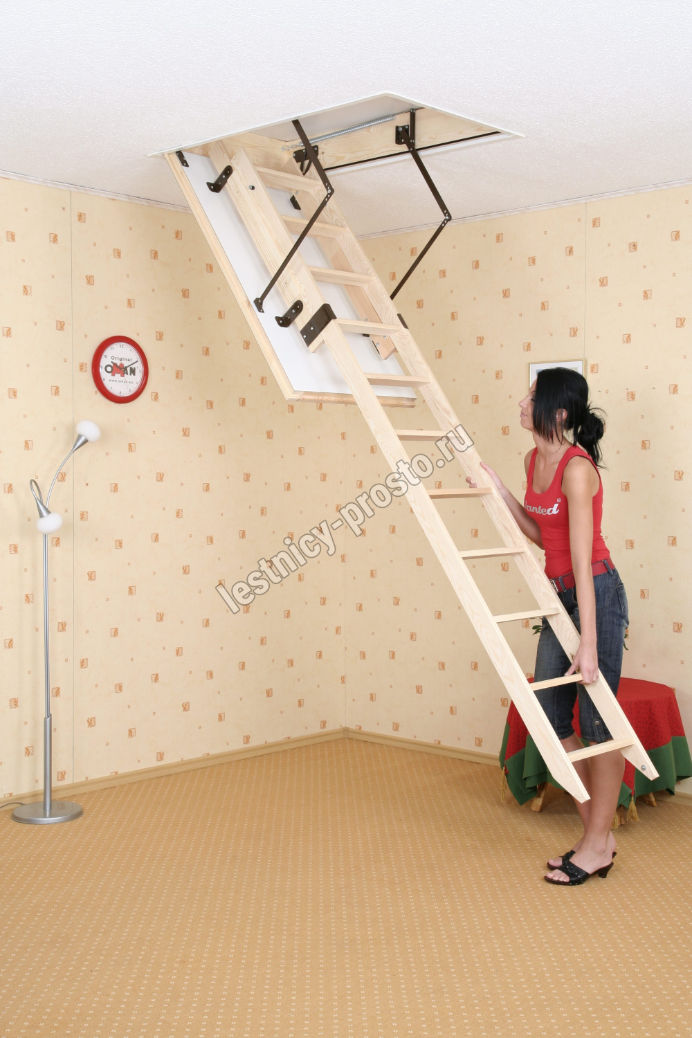 Лестница раздвижная двухсекционная, изготовлена из сосны. Термоизоляционная крышка типа "сэндвич" имеет усиленную теплозащиту, облицована с двух сторон ДСП белого цвета. По контуру короба имеется уплотнитель. Все металлические элементы лестницы покрыты порошковой краской, ступени лестницы имеют антискользящие насечки и закреплены в столярное соединение «ласточкин хвост», что позволяет выдерживать нагрузку 150 кг. При раскладывании лестницы нет вылета за пределы короба, что позволяет использовать эту модель лестницы в таких помещениях, где невозможно использовать чердачные лестницы с большим разбегом открытия. Удобна для эксплуатации на большой высоте. Деревянный стержень для открывания лестницы в комплекте..