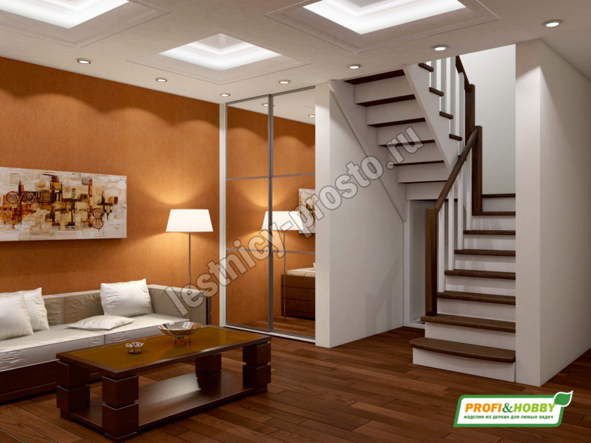 Обратите внимание! Данный вариант лестницы изготовлен из сосны эконом-класса, имеющей заметные серые/синие вкрапления цвета - это не отражается на прочности лестницы, но может быть заметно при покраске в светлые тона.