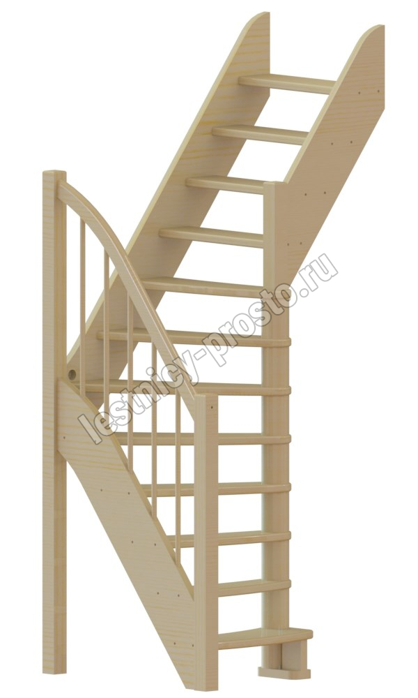 Конструкция лестницы отличается от базовой модели изящными изогнутыми тетивами и поручнем, закругленными забежными (поворотными) ступенями.