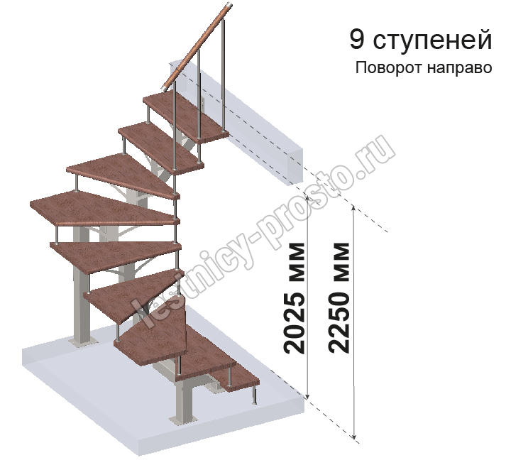 Комплект ограждений для П-образной лестницы MONO h225 из 9 ступеней.