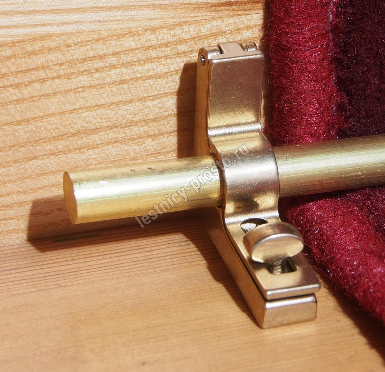 Ковродержатель комплектуется двумя держателями из латуни цвета золото, а также цельным прутком из латуни длиной от 171 до 200 см. Конструкция является сборно-разборной не требующей демонтажа креплений, что делает ее долговечной и очень удобной для чистки ковров и ковровых покрытий.