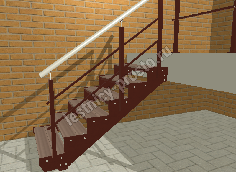 Ограждение типовой лестницы крашеное или из полированной нержавеющей стали. Базовый материал ступеней: террасная доска