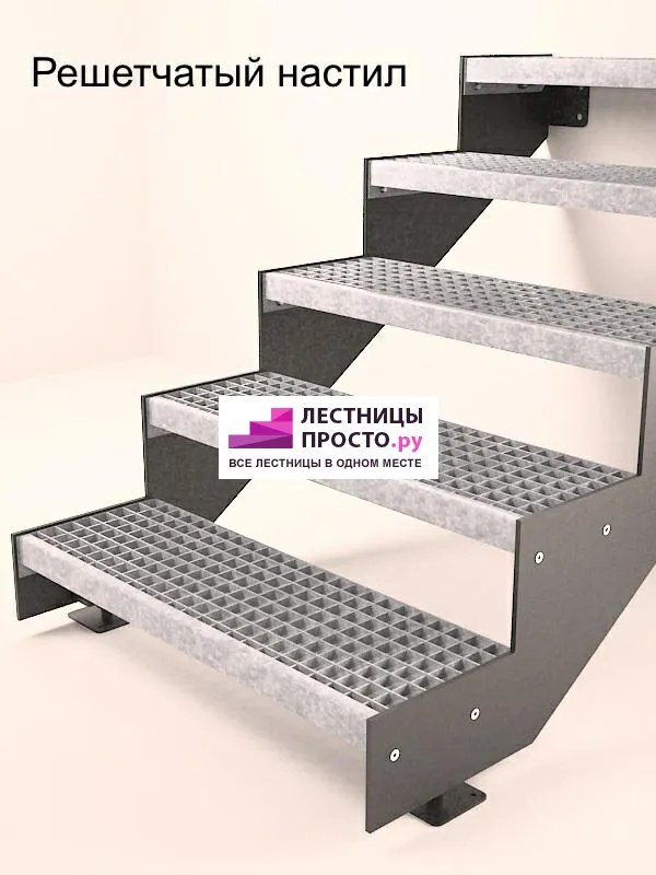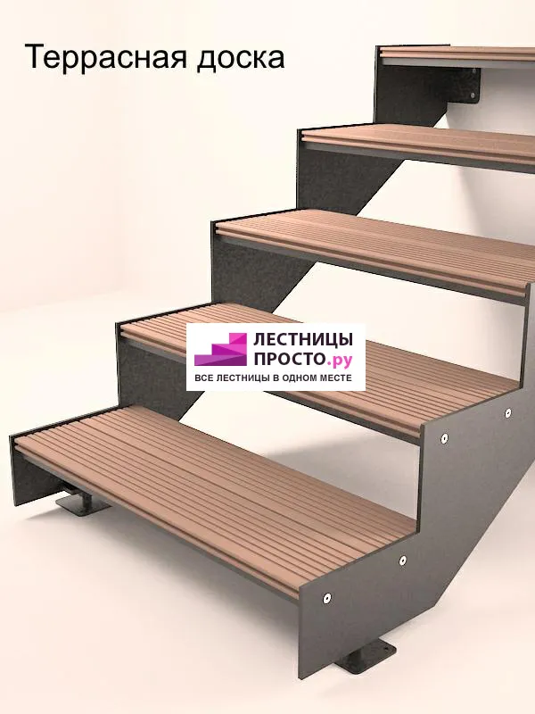 Покрытие порошковое, очень прочное и долговечное. Все детали каркаса крепятся с помощью болтов, благодаря чему Вы можете собрать каркас самостоятельно без применения сварки. В зависимости от ширины лестницы, каркас состоит из двух (ширина до 1 метра) или трех (ширина до 2 метров) опорных балок (тетив). Ступени лестницы состоят из металлической рамки, обеспечивающей необходимую прочность, и покрытия из террасной доски ДПК (древесно-полимерный композит). Ступени не боятся воды и мороза, не теряют со временем свой внешний вид и не требуют ухода. Нержавеющая сталь, которую мы используем для ограждений на улице - неприхотлива в обслуживании, выглядит стильно и прекрасно выдерживает капризы погоды