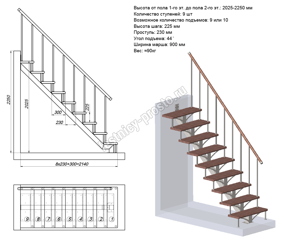 Лестница PROSTO MONO прямая, h225 см, ступени хвоя