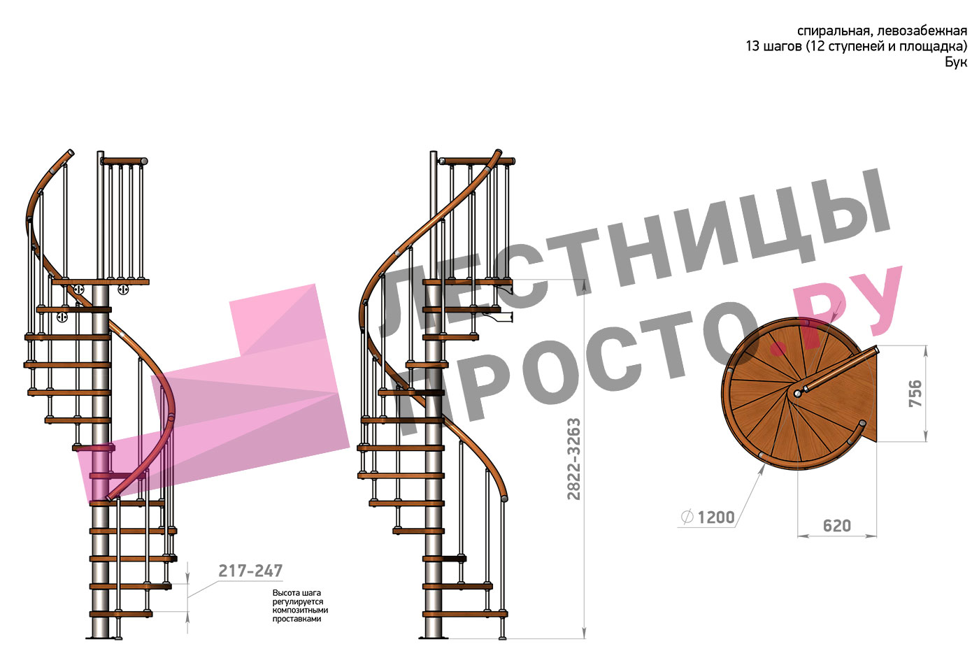 Левая, d=120см, 13 ступеней + площадка