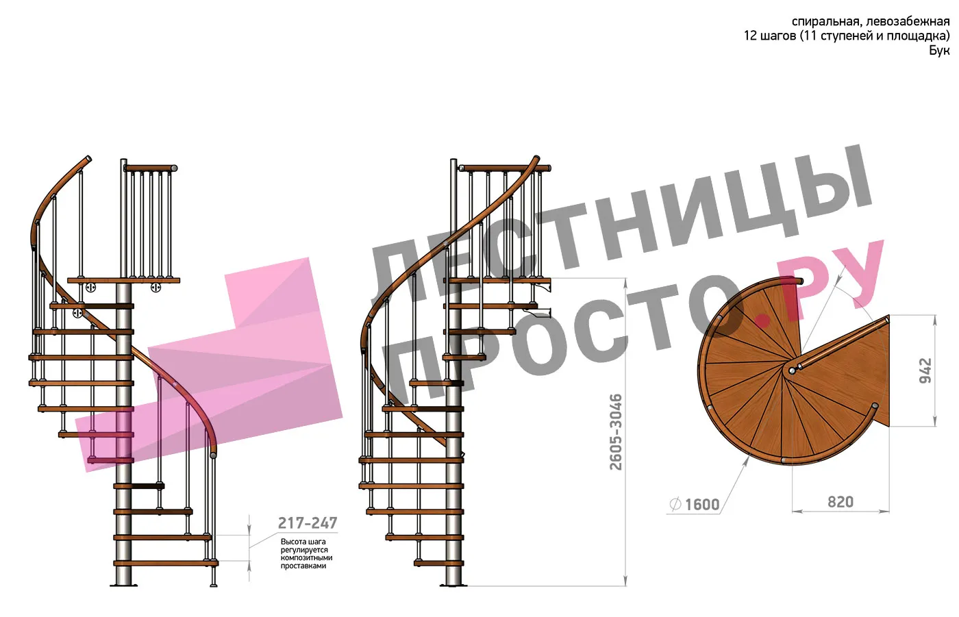 Правая, d=120см, 11 ступеней + площадка